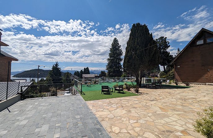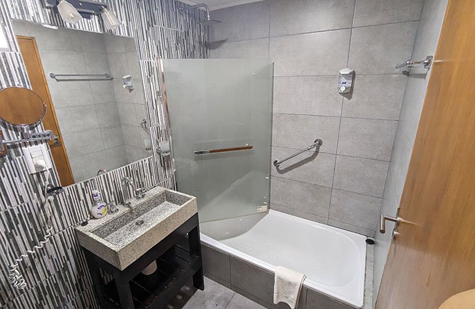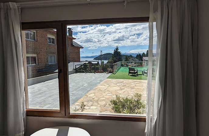 Baño completo con secador de pelo y bidet. Con vista al lago. Tiene el ingreso por la terraza del apart.