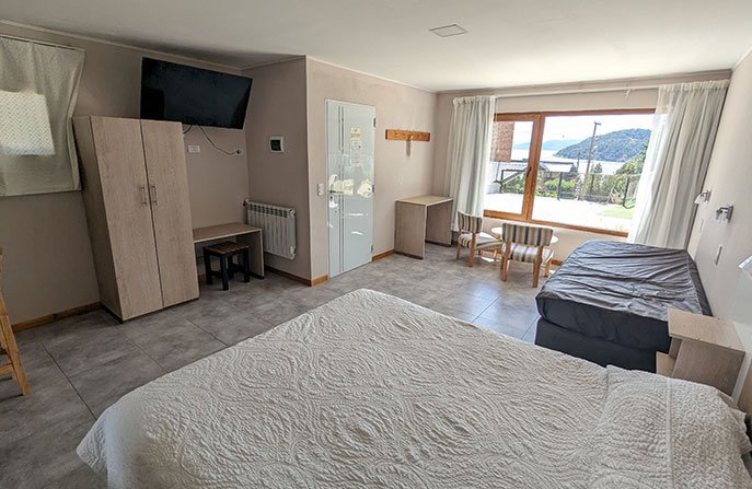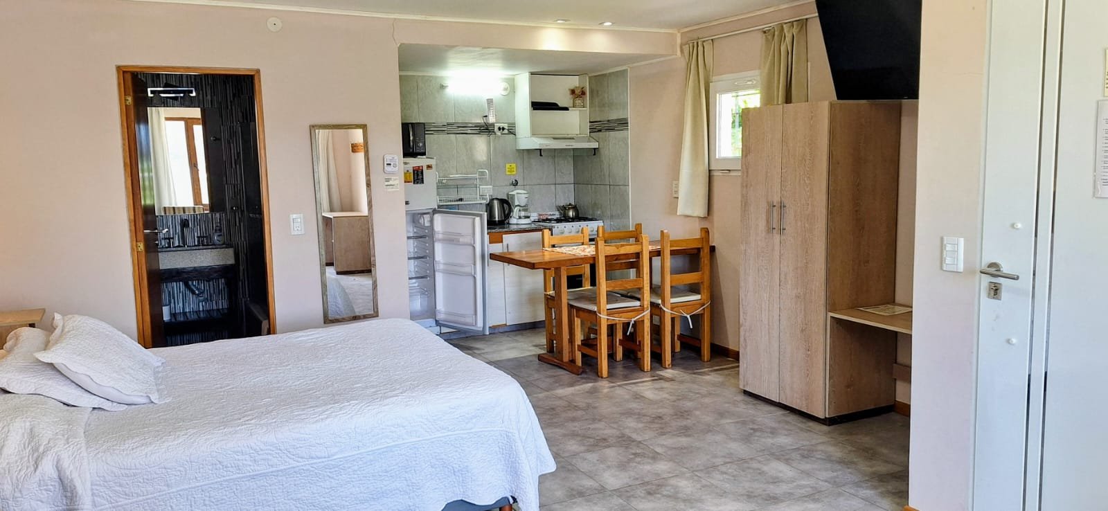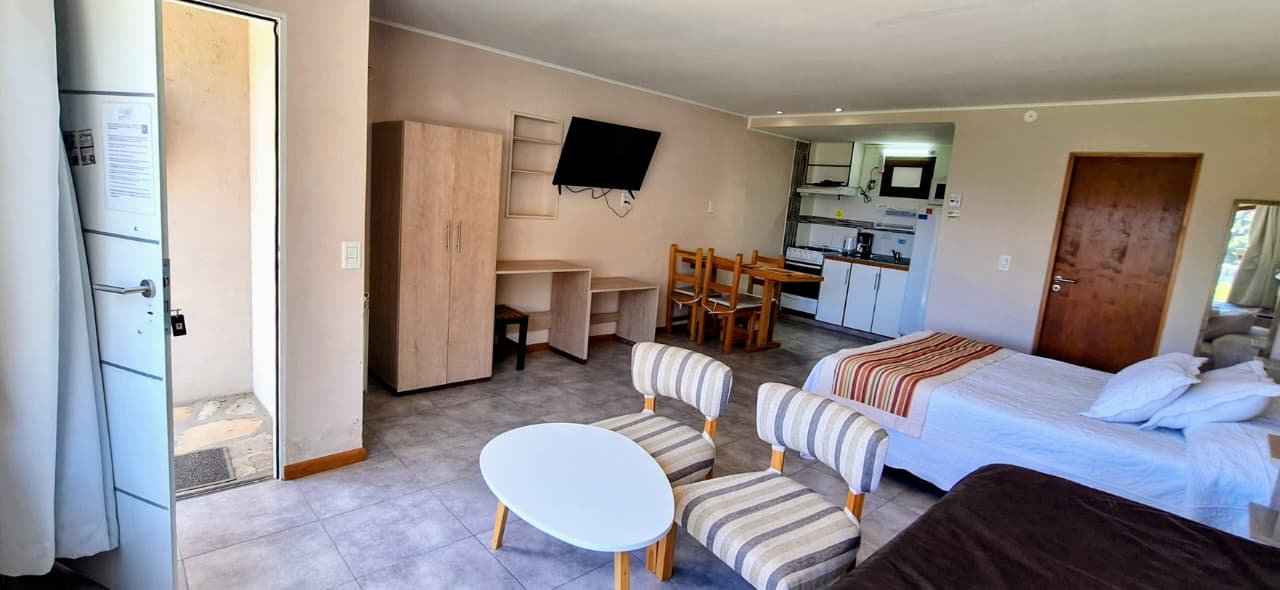 Unidad con un somier queen matrimonial y un somier de una plaza, cocina con horno, mesa desayunadora y taburetes, tv de 40”, silloncitos y mesa ratona,